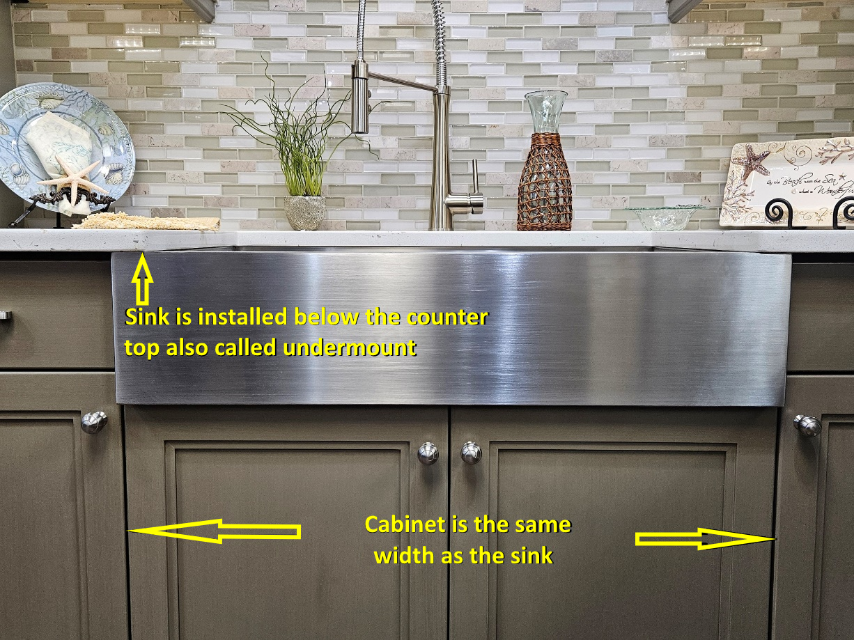 Apron sinks (also known as farm sinks) are a very popular alternative to the basic undermount sink. They are taller, deeper, and have a waterproof apron front which is ideal for cleaning large cookware. The image below depicts an apron sink installed over a full-width, base cabinet under the countertop, which is the most common way to install an apron sink. These sinks should be installed inside the sink base cabinet (and checked for proper fit) prior to templating and installing the countertops.
