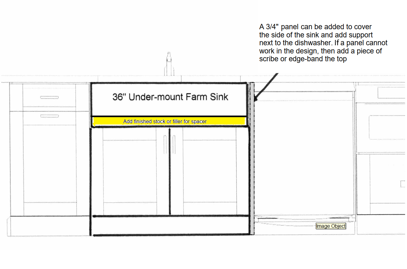 2. If a custom cabinet isn't available, a generic sink base cabinet will need to be cut by the installer to match the apron sink. Moreover, there will likely be space between the doors and the sink, as shown in the picture below. That space can be filled later with an overlay filler or a piece of stock.